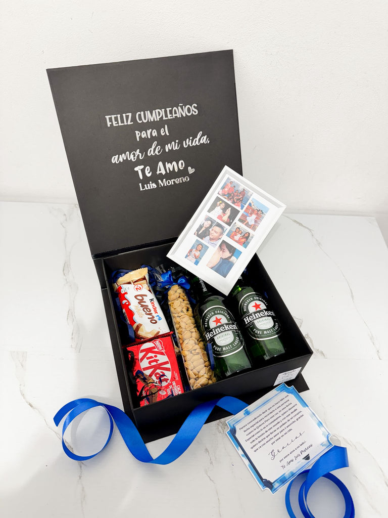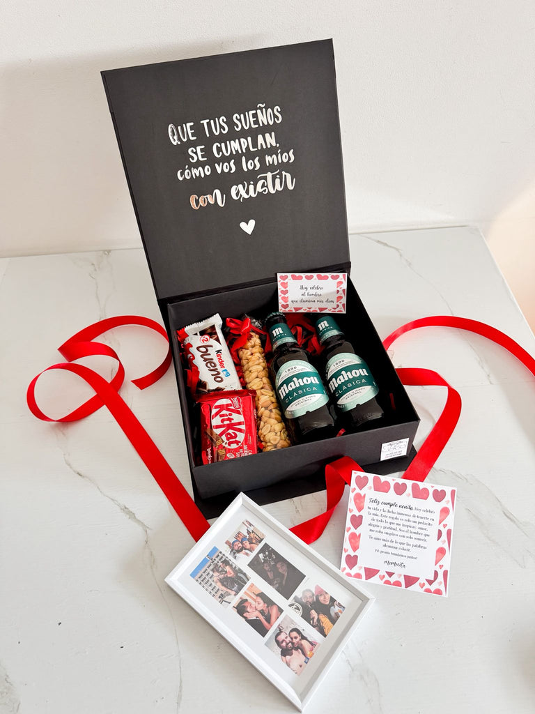 Caja sorpresa con cervezas, chuches y marco de fotos