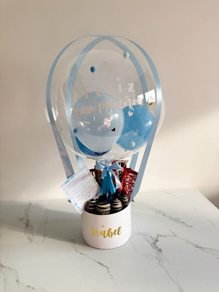 Traemos para ti este bello globo aerostático con fresas cubiertas de chocolate y chocolates variados que no podrá resistir tu persona favorita.